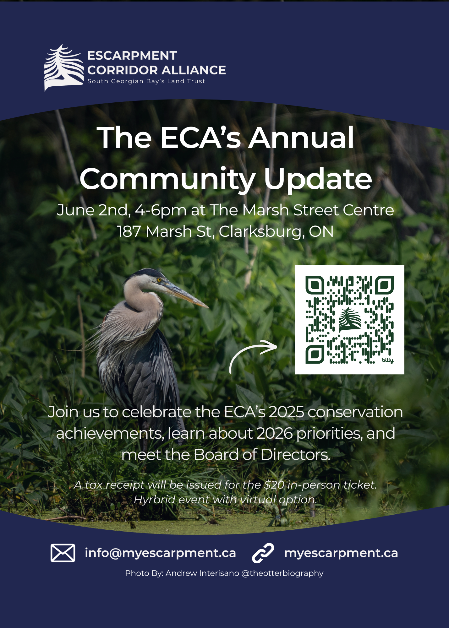 On June 2nd from 4-6pm, join us for our first annual community update at the Marsh St. Centre in Clarksburg, ON. Discover the ECA’s priority objectives for 2026, meet the Board, and hear directly from our leadership.